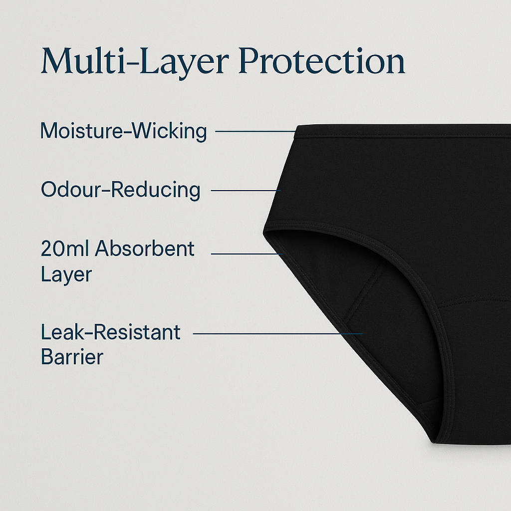 - Slim absorbent layer (20ml) handles Light to medium days & light bladder leaks